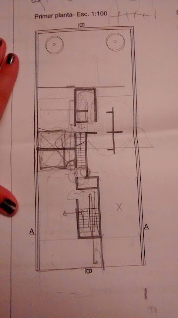 Luego de probarlo en planta y en corte surgió el problema de que la losa dejaba un espacio de medio nivel en la planta inferior por lo que tuvimos que dejar de lado la idea de trabajar con una articulación de medios niveles entre usos.